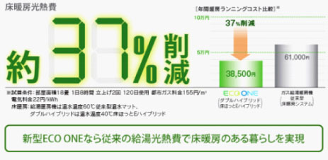 新型ECO ONEダブルハイブリッドタイプは、給湯だけではなく床暖房もハイブリッド運転します。さらにリンナイ独自の床ほっとEハイブリッドとの組み合わせにより床暖房のランニングコストも2万円以上削減することができました。